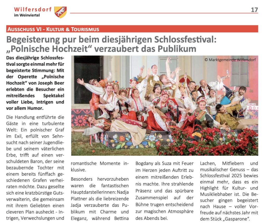 Polnische Hochzeit Gemeindezeitung Wilfersdorf 03/2025 NÖN Woche 27/2025 Die Fledermaus NÖN Woche 27/2024 Berziksblätter Niederösterreich Woche 27/2024 – Ilse Reitner NÖN Woche 17/2024 NÖN Woche 15/2024 – Michael Pfabigan Die Lustige Witwe NÖN Woche 27/2023 – Michael Pfabigan Bezirksblätter Niederösterreich 05./06. Juli 2023 – Ilse Reitner Gemeindezeitung Wilfersdorf